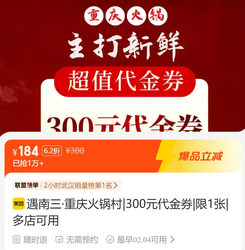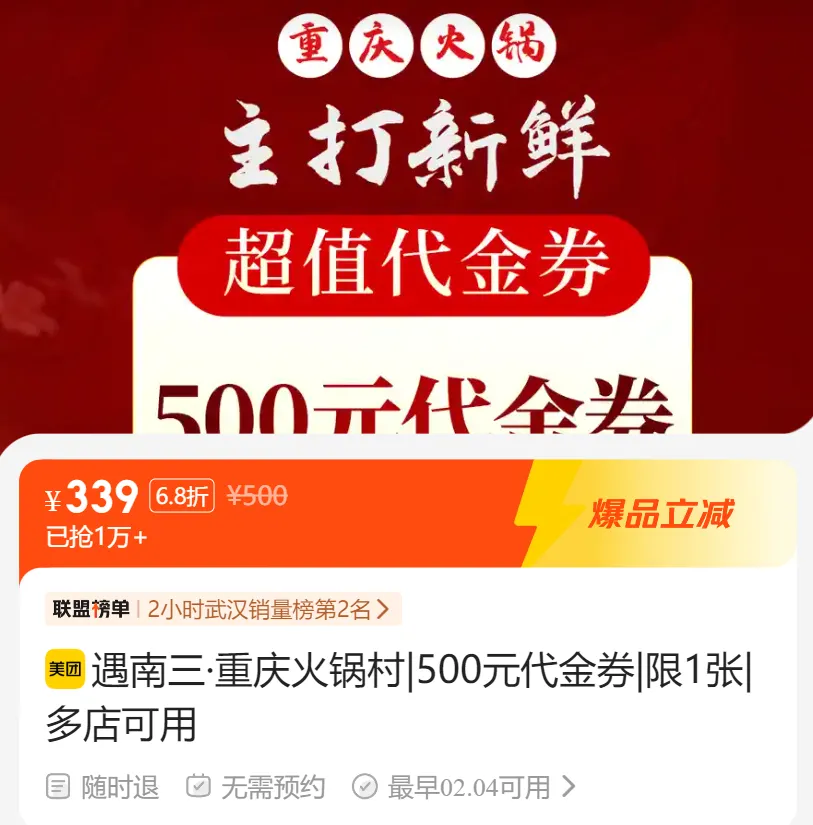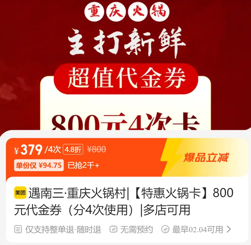 🔥【遇南三·重庆火锅村|500元代金券|限1张|多店可用】🔥【遇南三·重庆火锅村|500元代金券|限1张|多店可用】🔥【遇南三·重庆火锅村|【特惠火锅卡】800元代金券(分4次使用)|多店可用】🔥【遇南三·重庆火锅村|【特惠火锅卡】800元代金券(分4次使用)|多店可用】📖具体使用规则见套餐详情