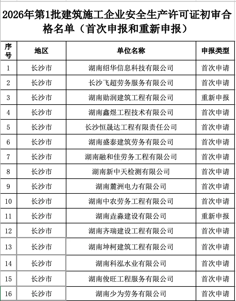 根据《湖南省住房和城乡建设厅关于印发<深化建筑施工企业安全生产许可“放管服”改革十条措施>的通知》(湘建法〔2022〕41号)等有关文件精神,我局组织对2026年第1批建筑施工安全生产许可证申报材料进行了审查,现将初审合格名单予以公示(见附件),审查不合格企业请登录“湖南省建筑施工企业安全生产许可证审批信息系统”查询审查意见。公示期为2026年2月3日至2026年2月9日。