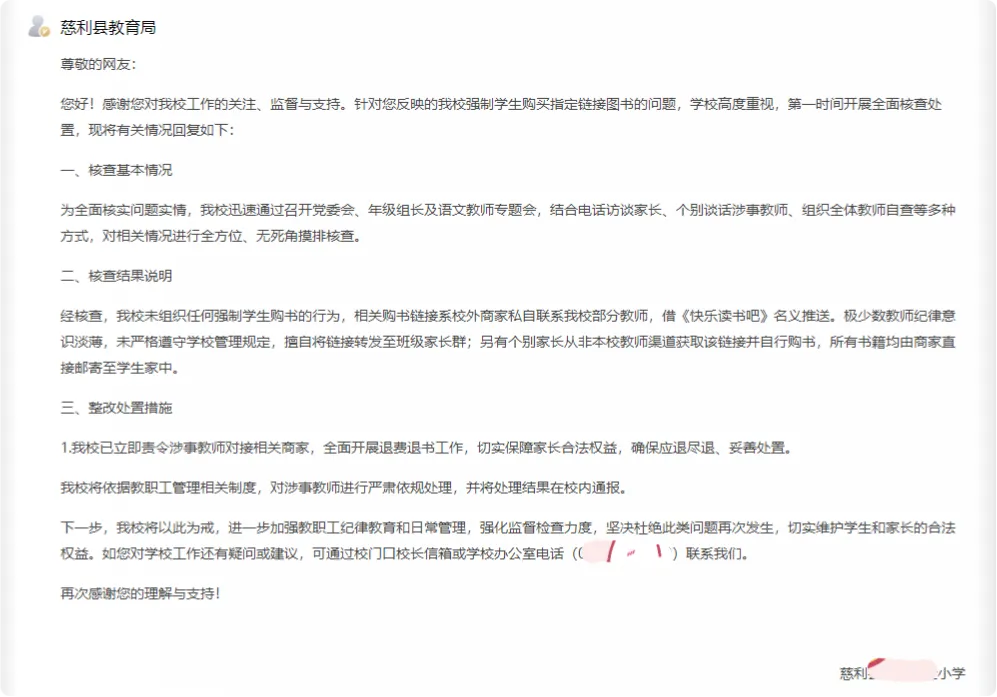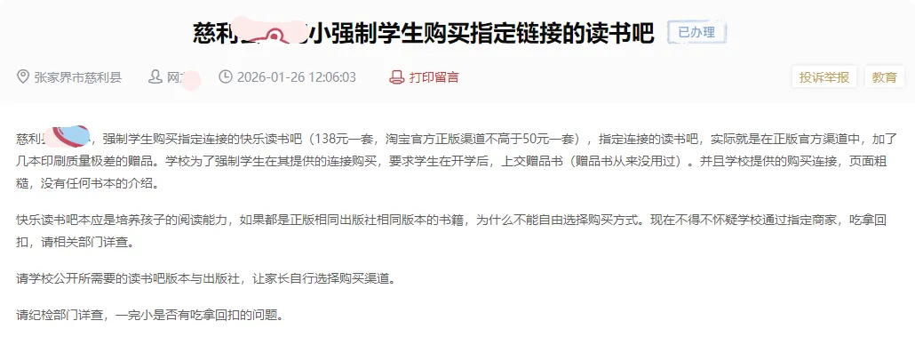 近日,有湖南张家界的小学生家长在问政平台上留言,投诉学校强制学生购买指定链接书籍的行为。这位网友反映称,慈利县某小学存在学生购买指定连接的《快乐读书吧》,这套《快乐读书吧》在购物平台官方正版渠道不高于50元一套,指定连接中的不过加了几本印刷质量极差的赠品,就要138元一套,并且学校为了强制学生在其提供的连接购买,要求学生在开学后,上交赠品书(赠品书从来没用过)。他(她)质疑,《快乐读书吧》本应是培养孩子的阅读能力,如果都是正版、相同出版社、相同版本的书籍,为什么不能自由选择购买方式,而要通过指定商家的方式购买?要求相关部门调查,看看里面是否存在吃拿回扣的问题。针对该留言,校方在进行全方位、无死角摸排核查后,公开回复称:我校未组织任何强制学生购书的行为,相关购书链接系校外商家私自联系我校部分教师,借《快乐读书吧》名义推送。极少数教师纪律意识淡薄,未严格遵守学校管理规定,擅自将链接转发至班级家长群;另有个别家长从非本校教师渠道获取该链接并自行购书,所有书籍均由商家直接邮寄至学生家中。目前,学校已立即责令涉事教师对接相关商家,全面开展退费退书工作,切实保障家长合法权益,确保应退尽退、妥善处置,并将依据教职工管理相关制度,对涉事教师进行严肃依规处理,并将处理结果在校内通报。下一步,我校将以此为戒,进一步加强教职工纪律教育和日常管理,强化监督检查力度,坚决杜绝此类问题再次发生,切实维护学生和家长的合法权益。应该说,那些“个别”教师以及家长的出发点是好的,无非是希望学生能够多一些阅读优秀读物,以提高成绩和综合素质,只是在向学生及家长们推荐课外书籍的过程中,采取的方式和态度存在问题。这件事情也反映了日常家校沟通的复杂性,一方面老师、家委会与家长之间需要保持紧密的沟通,分享包括教辅资料等方方面面的信息,才能力求为学生提供最好的教育条件和教育资源;但另一方面,如果方式和尺度不对,又很容易损害学生及家长的权益,并导致家校矛盾。正因为如此,教育主管部门以及学校才必须加强日常的监督管理,并建立长效机制,规范教职工纪律教育和日常管理行为,才能避免类似问题的发生。