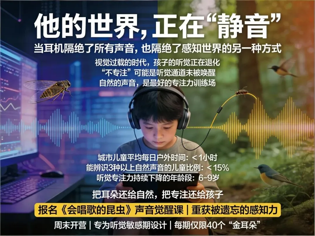 《会唱歌的昆虫》——我们的第五个周末研学主题,将带领孩子关闭一部分视觉,打开一个被忽略的、由声音构成的奇妙宇宙。