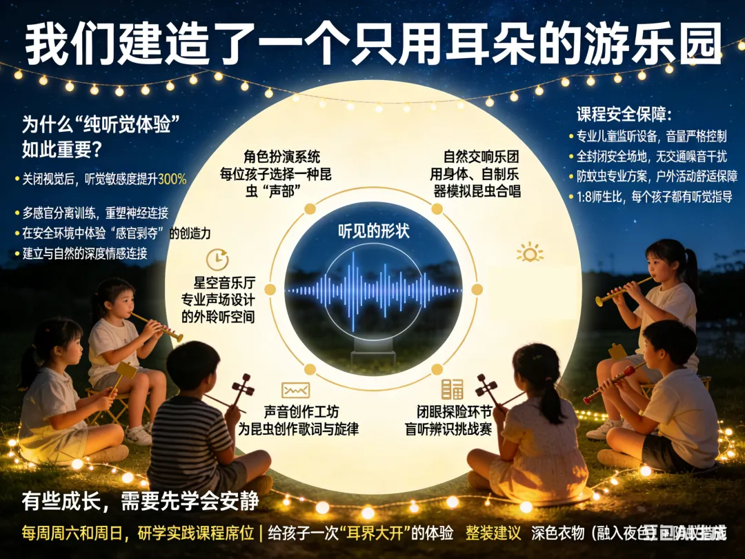 📅 课程时间:每周周六和周日:8:00-17:00👥 招募对象:小学一至三年级(独立参加,每期限40人)📍 研学地点:市自然营地或基地(专业静音环境)💰 课程投资:398元/人(含专业听音设备、创作材料、保险、午餐、证书)