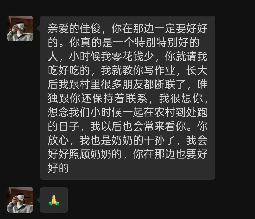“我和他(发小)没有合影,小时候没手机,男生之间拍照也少……”他沉默了一下,对话结束,肖文龙也对刘佳俊写下了自己想说的话:“我很想你,怀念我们小时候在村里到处奔跑的日子。以后我会常来看奶奶,我也是她的干孙子。你在那边,也要好好的。”
