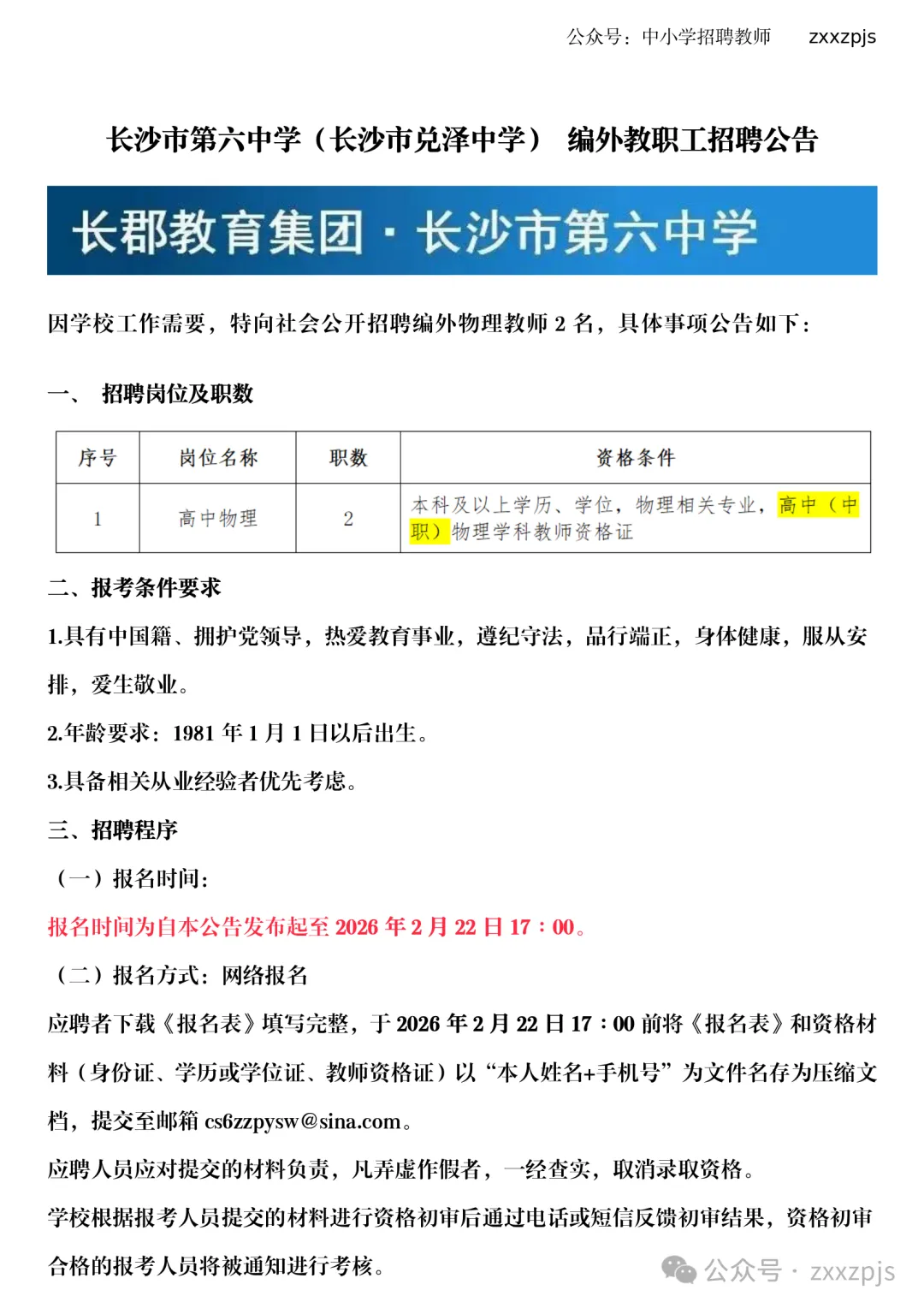 网络报名:应聘者下载《报名表》填写完整,于2026年2月22日17∶00前将《报名表》和资格材料(身份证、学历或学位证、教师资格证)以“本人姓名+手机号”为文件名存为压缩文档,提交至邮箱cs6zzpysw@sina.com。