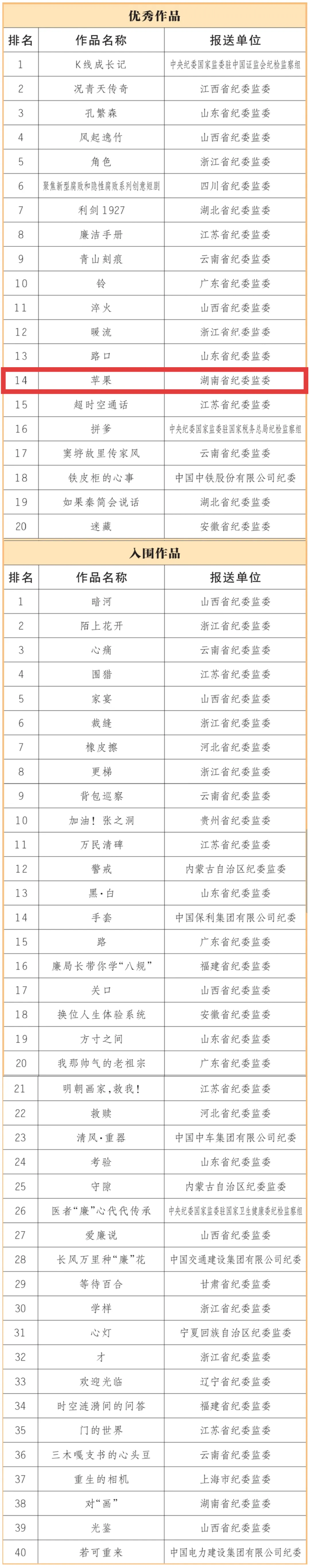 中央纪委国家监委网站讯 近日,由中央纪委国家监委宣传部、中央宣传部文艺局、中央网信办网络传播局联合主办,人民网承办的新时代廉洁文化微短剧征集展播活动,公布了20部优秀作品、40部入围作品(名单附后)。浙江省纪委监委、山西省纪委监委、中央纪委国家监委驻中国证监会纪检监察组等10家单位获评优秀组织单位。