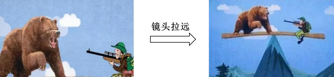 这两幅漫画呈现出从局部对立到整体关联的不同视角,从局部看,《对视与交锋》展现的是熊与猎人的直接冲突,熊的攻击姿态和猎人的持枪防备,体现了个体间的对立。这是一种简单直接的矛盾呈现,象征着人类与动物在生存资源、领地等方面的竞争,反映出人类为了自身利益,对动物生存空间的挤压,这种局部视角下的对立,是一种狭隘的、短视的认知。而《救赎与平衡》将视野拓宽,展现出二者在天地自然这个大环境下处于跷跷板两端的平衡关系。此时,自然元素的出现,不仅丰富了画面,更揭示了人类与动物同属自然生态系统的本质。若一方破坏平衡,双方都将走向毁灭。在全球生态环境问题日益严峻的当下,人类与动物、人与自然如何和谐共生,是亟待解决的重要课题。这两幅漫画正是对这一时代主题的生动诠释,警示我们不能只着眼于眼前的利益和局部的冲突,而应从更宏观的角度看待人与自然的关系。同时,两幅图放在一起,可启迪人们未知全貌不予置评,所处境况不同应有不同的评判标准,不要急于下结论。初看或许觉得对方是威胁,换个角度看也许互为救赎,当危险与救赎同时存在时需要我们追求平衡,而平衡可以是保持静止或是继续对抗。但若是人类能够把征服的行为转换成保护的举措也可以解除危机与冲突,带来更深层次的和谐。