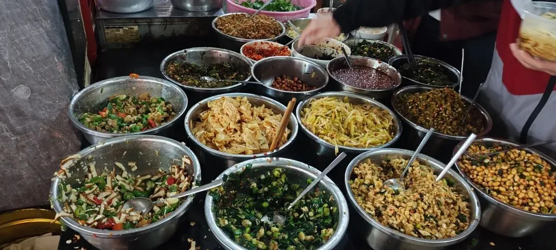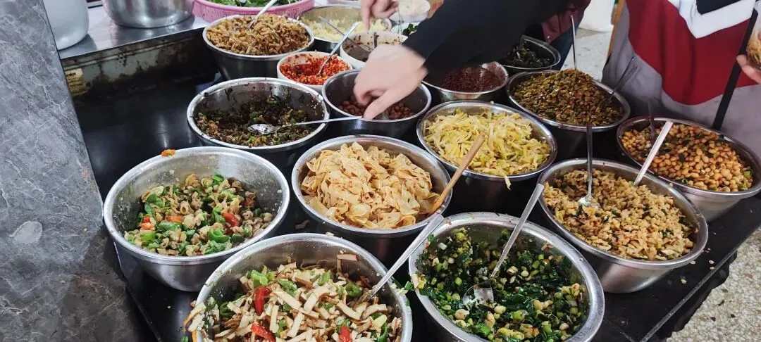 重点在于配菜免费加,种类之丰富是我生平罕见,差不多有18种之多,从榨菜、海带、花生米、萝卜干、豆腐干、酸笋干、豆皮等等,关键不限制你加多少,只要你不浪费,里面很多种类的小菜在卤菜店里随便称一称估计都要十多块。