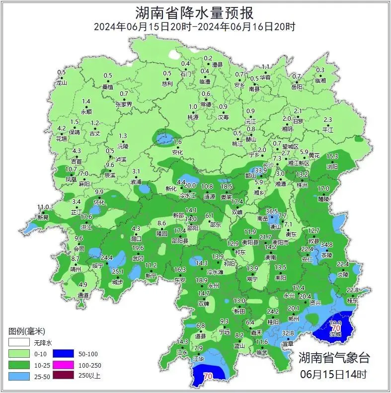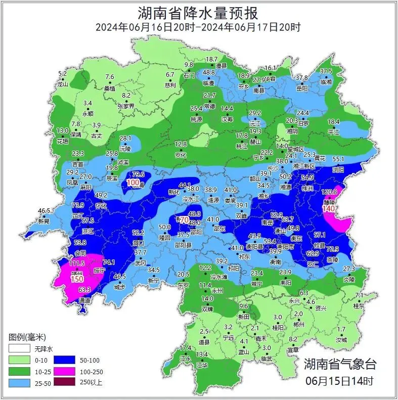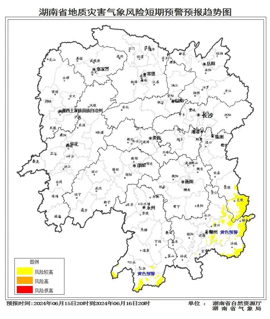根据地质灾害成灾规律和孕灾条件,结合2024年6月15日短期气象预报情况,省自然资源厅与省气象局联合会商得出如下结论:自6月15日20:00至16日20:00,受降雨影响,湘南部分区域发生突发性地质灾害风险较高