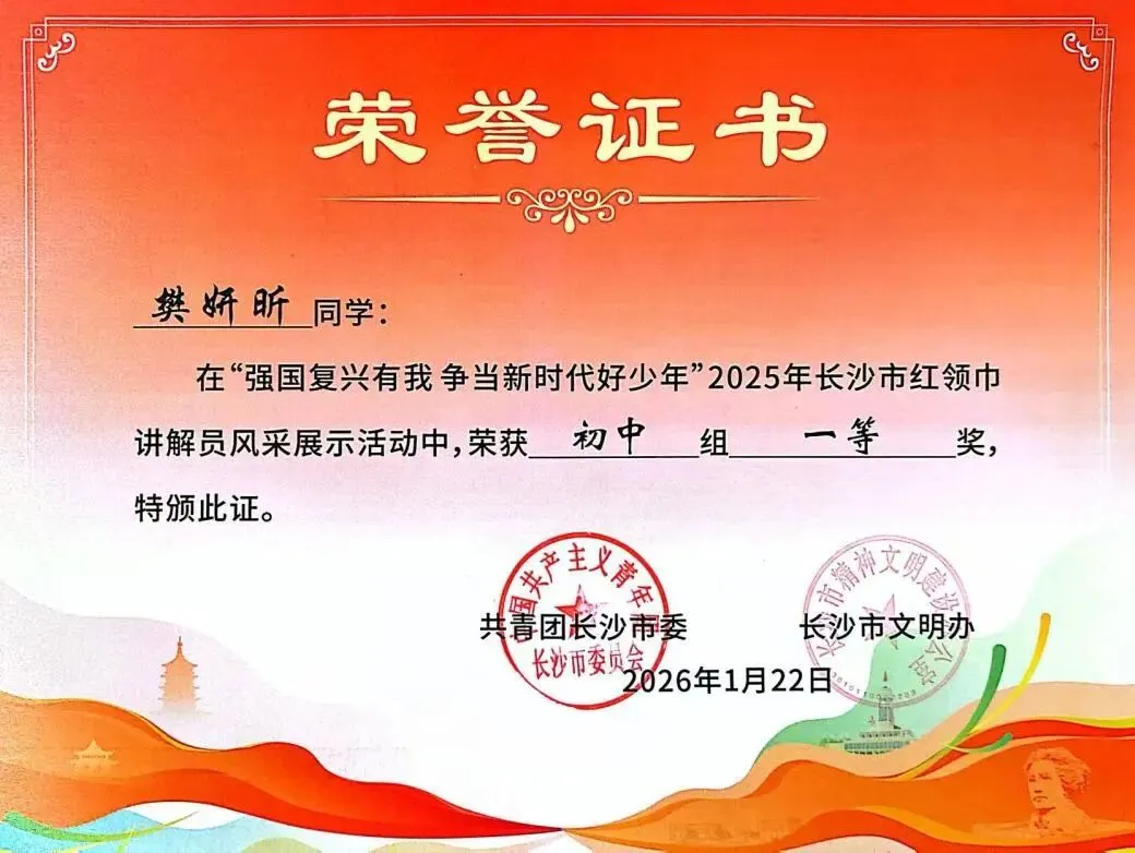 近日,在共青团长沙市委、长沙市文明办联合主办的“强国复兴有我 争当新时代好少年”2025年长沙市红领巾讲解员风采展示活动中,我校2513中队樊妍昕同学展现了优异的综合素养与讲解风采,在比赛中荣获一等奖的佳绩。
