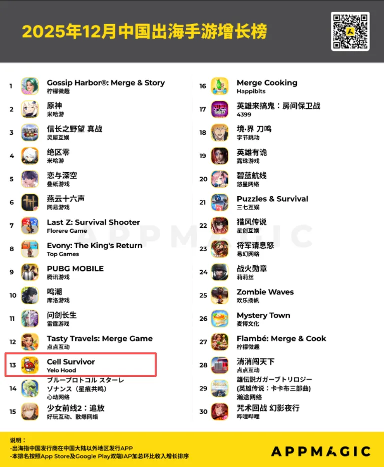 在AppMagic之前发布的2025年12月中国出海手游排行与增长榜中,与榜单头部呈现固化态势相比,增长榜第13名的一款中度混休游戏引发了行业的强烈兴趣。