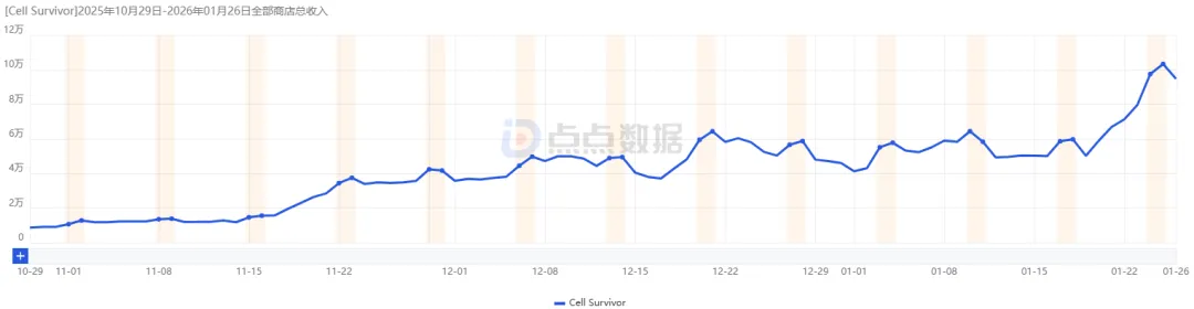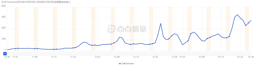 在双端收入构成上,iOS平台成为了该产品的绝对营收主力。点点数据显示,统计周期内iOS端收入占总收入的比例约为80%,而Google Play端占比约为20%。在当前的海外发行策略下,该产品的商业化重心更多向苹果生态倾斜。通常情况下,iOS用户在数值养成类游戏中的付费意愿和留存表现往往高于安卓用户,这一数据侧面反映了《Cell Survivor》虽然披着休闲游戏的外衣,但其核心用户群具备中重度游戏的付费习惯。