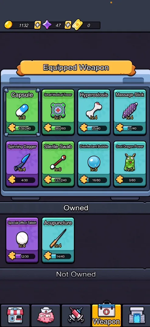 游戏提供了丰富的武器库,包括“医用棉签”、“注射器”、“胶囊药丸”等。不同的武器拥有截然不同的攻击逻辑。例如,“医用棉签”被设计为一种近程环绕型的AOE武器,适合处理逼近防线的敌人;而“注射器”则是一种高射速的直线穿透武器,适合对长龙的直线段落进行高爆发输出。