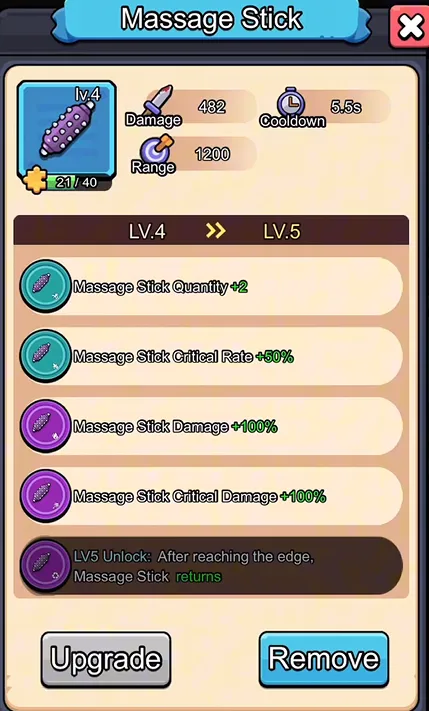 首先是武器稀有度体系。游戏并未采用休闲游戏常见的“通关解锁武器”模式,而是引入了卡牌游戏中的颜色分级,绿、蓝、紫、橙、红。低稀有度的武器虽然机制可用,但其基础攻击力和成长上限被限制;而高稀有度的武器不仅数值更高,往往还附带额外的特殊词条。