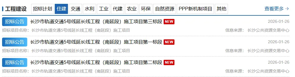 1月26日,长沙公共资源交易中心连发3条长沙市轨道交通5号线延长线工程(南延段)施工项目招标公告。