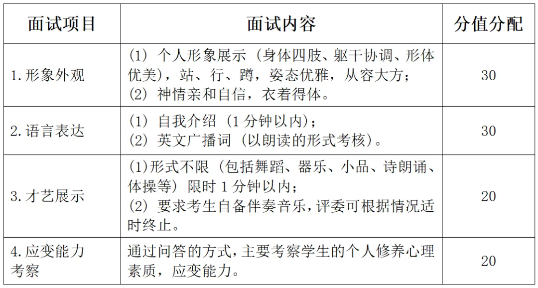 (4)视力要求:女生矫正视力0.5以上,男生裸眼视力0.7以上(C字表视力标准),凡视力不达标的考生须提前配好矫正眼镜参加专业面试;眼球大小适中,对称,目光有神,无斜视、无色盲、色弱。