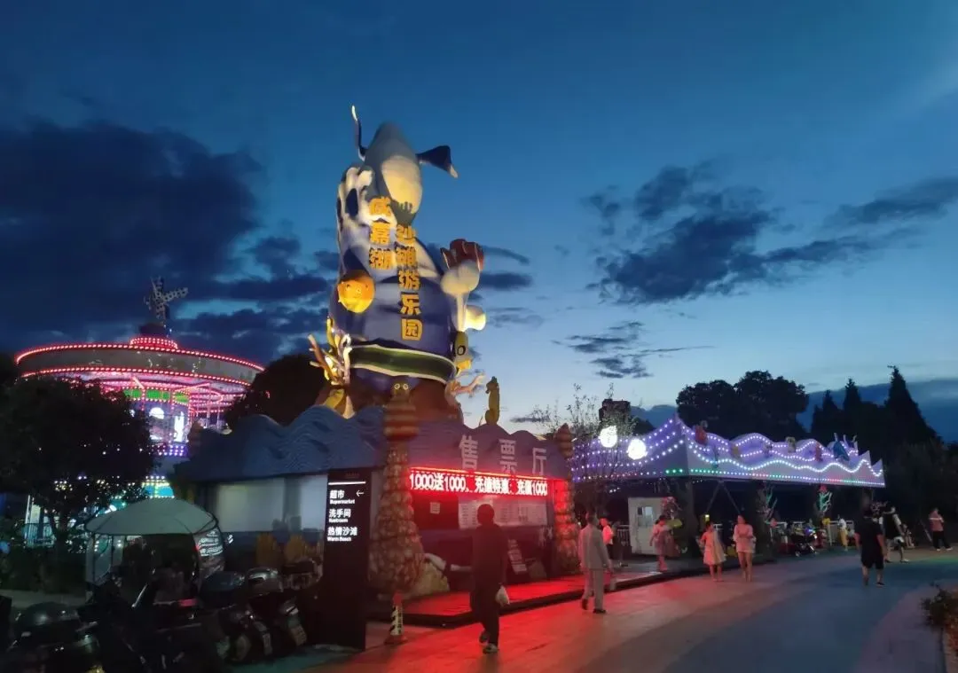 沿着长沙西湖南岸,经过东广场,龙舟台,枫影地,就来到了长沙西湖的北岸最受孩子们欢迎的地方:热情沙滩。在这里建有大型的咸嘉湖沙滩游乐园。有爬山车、碰碰车、小火车、卡顶车乐园、无动力游乐园等游玩项目。一到晚上,灯光璀璨,西湖的夜,被游乐园的彩灯点亮,仿如一个梦幻的童话世界。孩子在过山车上的尖叫声响彻湖面。在近水边,有一片广阔的沙滩,阳光把沙滩上的细沙晒得发亮,孩子们在沙滩上尽情玩耍。他们或蹲沙滩前堆沙,或砌城堡,或用小铲挖沙沟,或用小手扬沙,或站在巨龟上腾掷跳跃。年轻的父母们坐在远处草地上,目光温柔地追随自家孩子的身影。湖面波光粼粼,倒映着远处高楼、岳麓山和近处孩子们身影,这是城市与童真最美的画图。