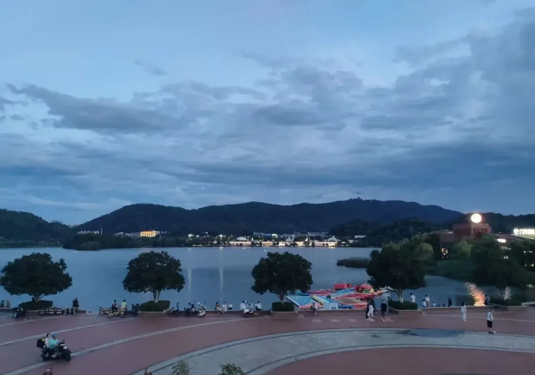 从热情沙滩过来,再走几百米,来到西湖的游船码头。要是夜晚来此。我觉得是西湖最美之处。湖面如绸缎般泛着幽蓝的微光,倒映着岳麓山及两岸渐次亮起的灯火。红白相间的船身,在夜色中格外醒目。湖心处,游船缓缓划开水面,船尾的涟漪将霓虹揉碎成闪烁的星子。情侣依偎在船头,晚风捎来断续的情话。你站在岸边,会觉得你仿佛穿越在古今交织的时空里。