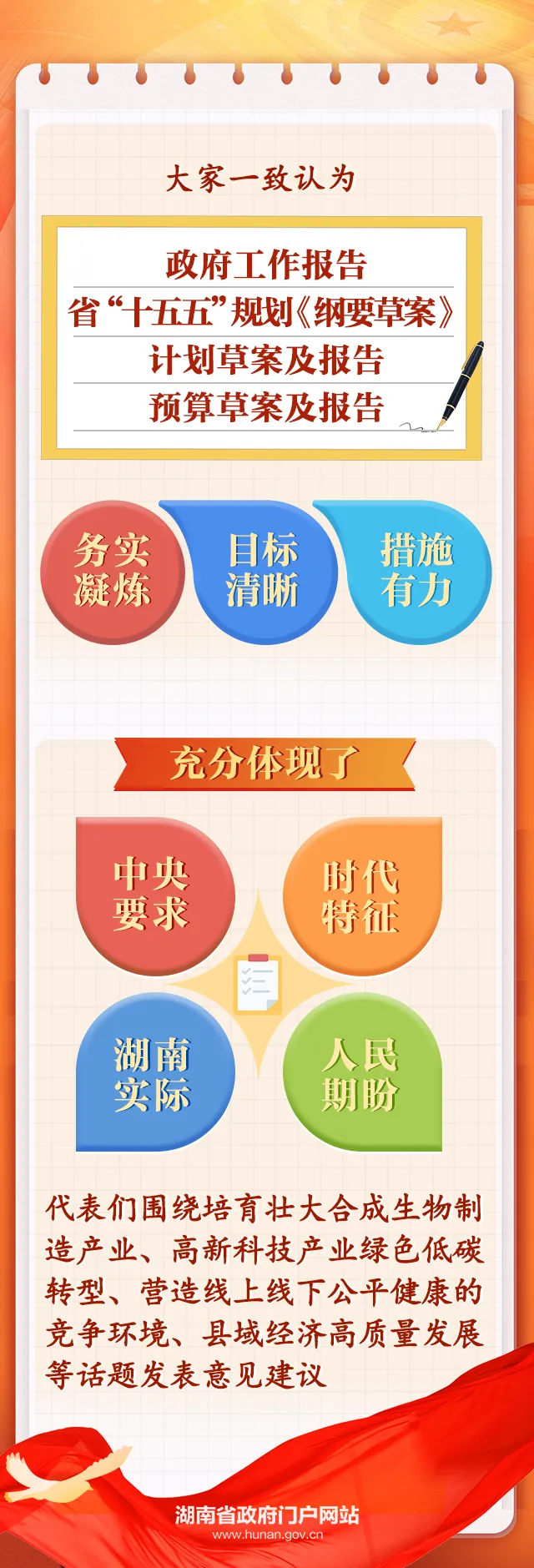 审议中,大家一致认为,三个报告及《纲要草案》务实凝炼、目标清晰、措施有力,充分体现了中央要求、时代特征、湖南实际、人民期盼。围绕培育壮大合成生物制造产业、高新科技产业绿色低碳转型、营造线上线下公平健康的竞争环境、县域经济高质量发展等话题,罗毅君、周振宇、高毅、李新罗、罗鉴远、张辉容、左菲、罗订坤、张友君等代表先后发表意见建议。