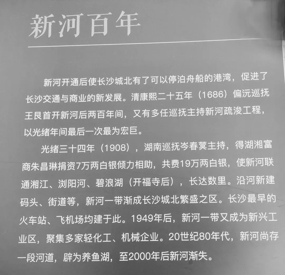 新河三角洲,是“南来北去”湘江(西)、“五十道弯到湘江”的浏阳河(北)交汇处,水运自然繁忙。1686年偏沅巡抚王艮率民工人工新开凿一条河,名叫新开河或新河,导浏阳河水入新河连碧浪湖与湘江,供舟船停泊在新河港湾,长沙城北区域的交通与商贸条件得到了很大改善,后来多任巡抚对新河疏通过。1908年长沙首富、慈善家朱昌琳(朱镕基曾伯祖父)捐7万两白银,又对新河进行大规模疏通,极大改善了新河区域的交通与商贸。新河码头又增加很多,客流物流量非常大,饭店商铺住宿铺增多,车水马龙,街市繁荣。这块区域因新开河兴旺繁华,成为开福宝地。2000年后新河才逐渐完全消失,2007年新河三角洲改称为北辰三角洲,全部成为住宅区、“三馆一厅”、学校、会议中心、商业区、公园等。