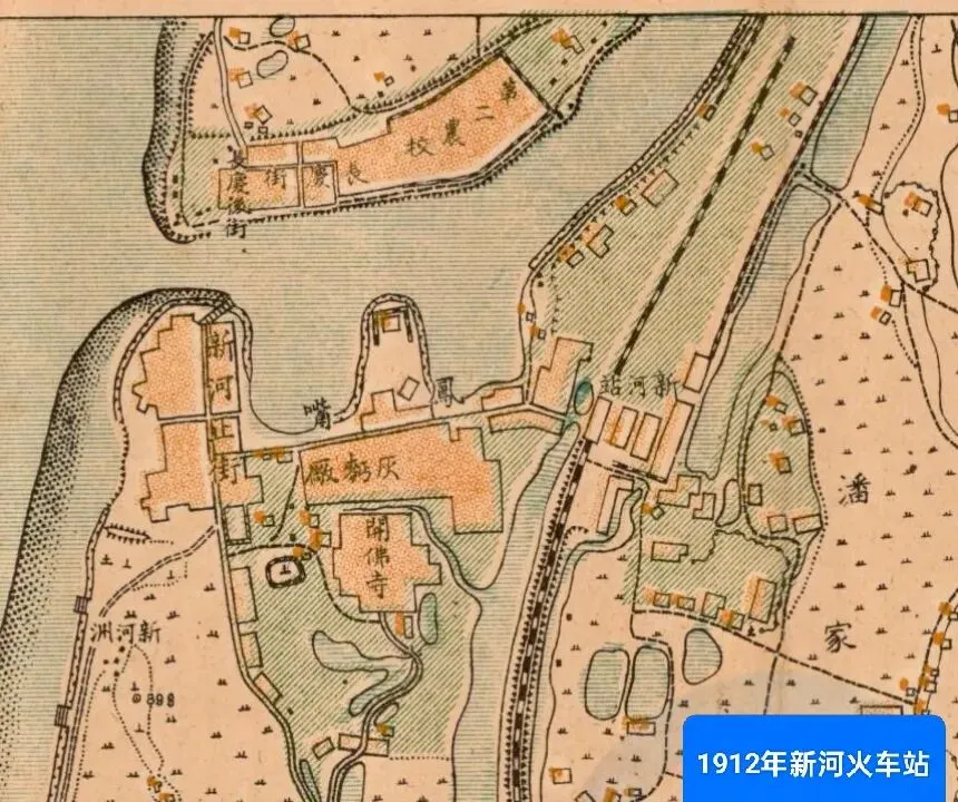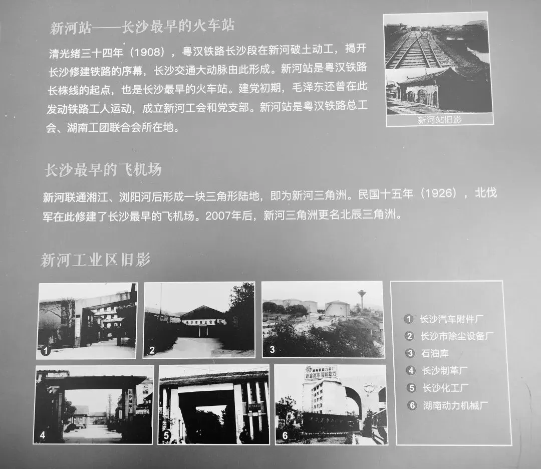 ①新河火车站是长沙最早的火车站。新河火车站是长株段铁路的起点,1908年开始修建,大致在如今黄兴北路与新河路相交的北面(原省动力机厂)奥城E7区域,新河南堤边,是粤汉铁路线上长沙城区最早修建的第一个火车站,是长沙重要的客运和货运站,经现在的鸳鸯井巷往东南方向进入老长沙北站。1914年,武昌至长沙段铁路分四段施工,并且对长沙城北铁路走向有小调整,从浏阳河铁路桥直通(弯改直)老长沙北站,没有按原规划(浏阳河铁路桥→沿新开河→新河火车站→鸳鸯井→老长沙北站)走向,武昌至长沙1918年9月通车。从1918年武-长-株段全线通车后,新河火车站客运功能逐渐转移至老长沙北站。1936年粤汉铁路全线贯通后,新河站的客运业务几乎全部停止,主要保留货运功能。1938年为阻止日军南侵,长沙市区的铁路线主动拆除铁轨、毁坏路基。新河火车站在此期间遭到日军炸毁,站房、轨道等设施被严重毁坏。抗战胜利后,新河站由于毁坏严重、场地小、边缘化等种种原因,没有得到修复。也就是说,从1938年开始,新河站站址逐渐荒废,其功能被长沙北站完全取代,新河火车站不存在了。1949后,长沙北站经鸳鸯井、黄兴北路有铁路运输线到新河三角洲大工业区。2000年左右,随着新河三角洲工厂外迁或调整及长沙北站北迁,这一片百年铁路区域的火车站和铁路全部拆除。现在主要是比较密集高档的住宅区和繁华的商业区,有地铁1号线、6号线、城际铁路交汇与通过,还将有规划中的地铁8号线、9号线。
