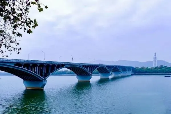 桥梁特点:橘子洲大桥是一座大型钢筋混凝土双曲拱桥,全长1532米,主桥21跨,最大跨径76米。其结构独特、造型美观,是当时全国规模最大、保存最完好的双曲拱桥之一。