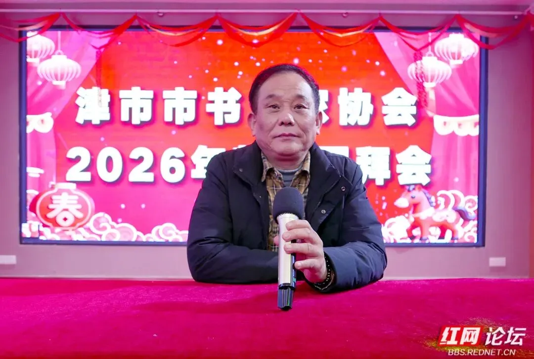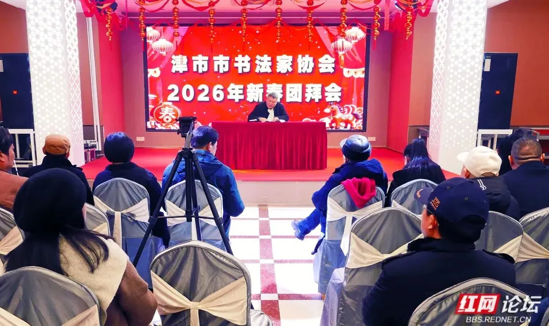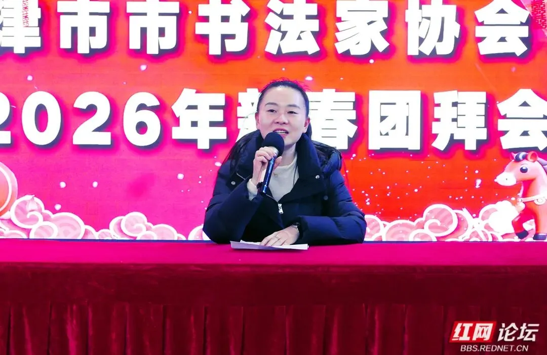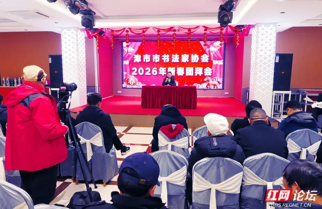 “辞旧岁翰墨凝香、迎新春笔韵传情”。1 月 28 日下午 2 时,常德市津市市皮厨宴会厅内翰墨飘香,津市市书法家协会 2026 年新春团拜会在此盛大举行。此次团拜会汇聚了津市市书法家协会全体会员以及多位重要嘉宾,其中包括常德市政协原副主席肖朝进,常德市退役军人事务局副局长伍子科,常德市文联副主席兼市书法家协会会长李泽民、党组书记青德明、秘书长王政清;津市市文联主席蔡婷、副主席高佳等。此外,会议还特邀了津市籍中国书法家协会会员、军旅书法家马先宏先生。