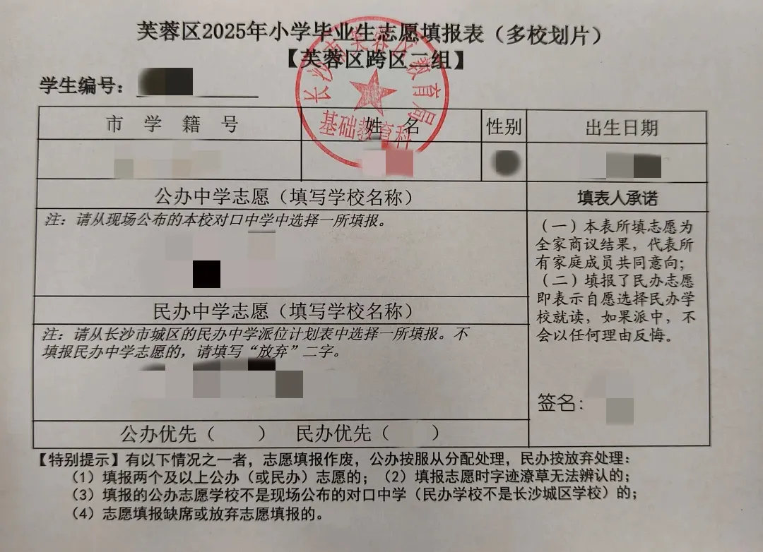 这是2025年芙蓉区跨区二组正式的志愿填报表。长沙小升初多校划片的志愿填报规则是,公办学校志愿为必填项,民办学校志愿为选填项。如果选择了填报民办学校志愿,那么就必须在公办优先和民办优先之间做出选择。一定要严格按照规则填写志愿,否则将被视为服从分配,这样孩子就有可能被随机派到相对薄弱的学校,家长们可要谨慎对待。