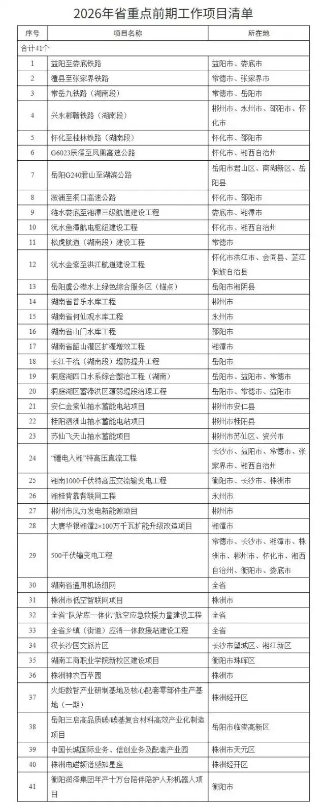 2月3日,湖南省发改委公布2026年省重点建设项目和省重点前期工作项目名单。其中,省重点建设项目389个,省重点前期工作项目41个。