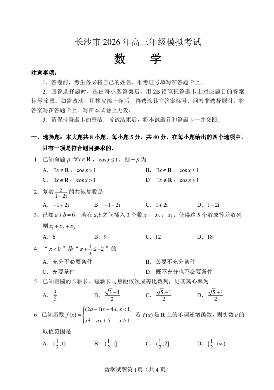 【长沙一模】2026 届湖南省长沙市高三年级第一次模拟检测试卷及答案合集丨文末附试卷下载链接