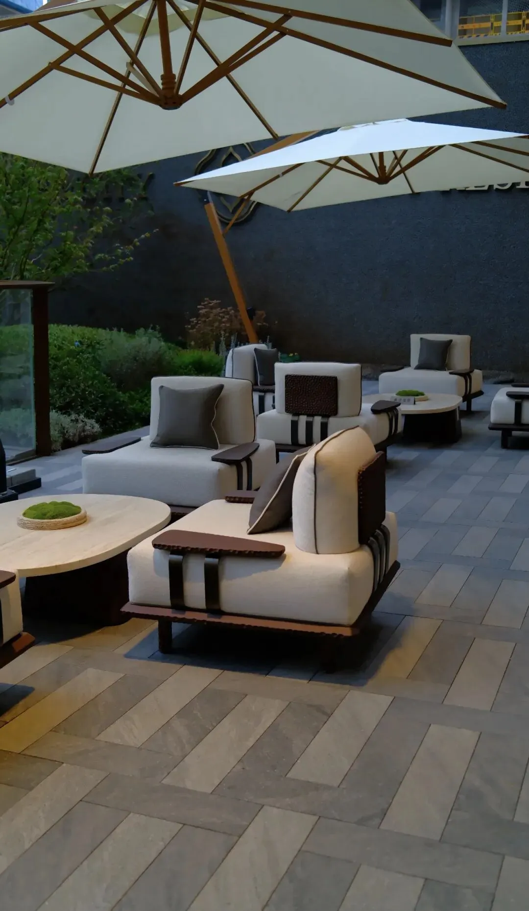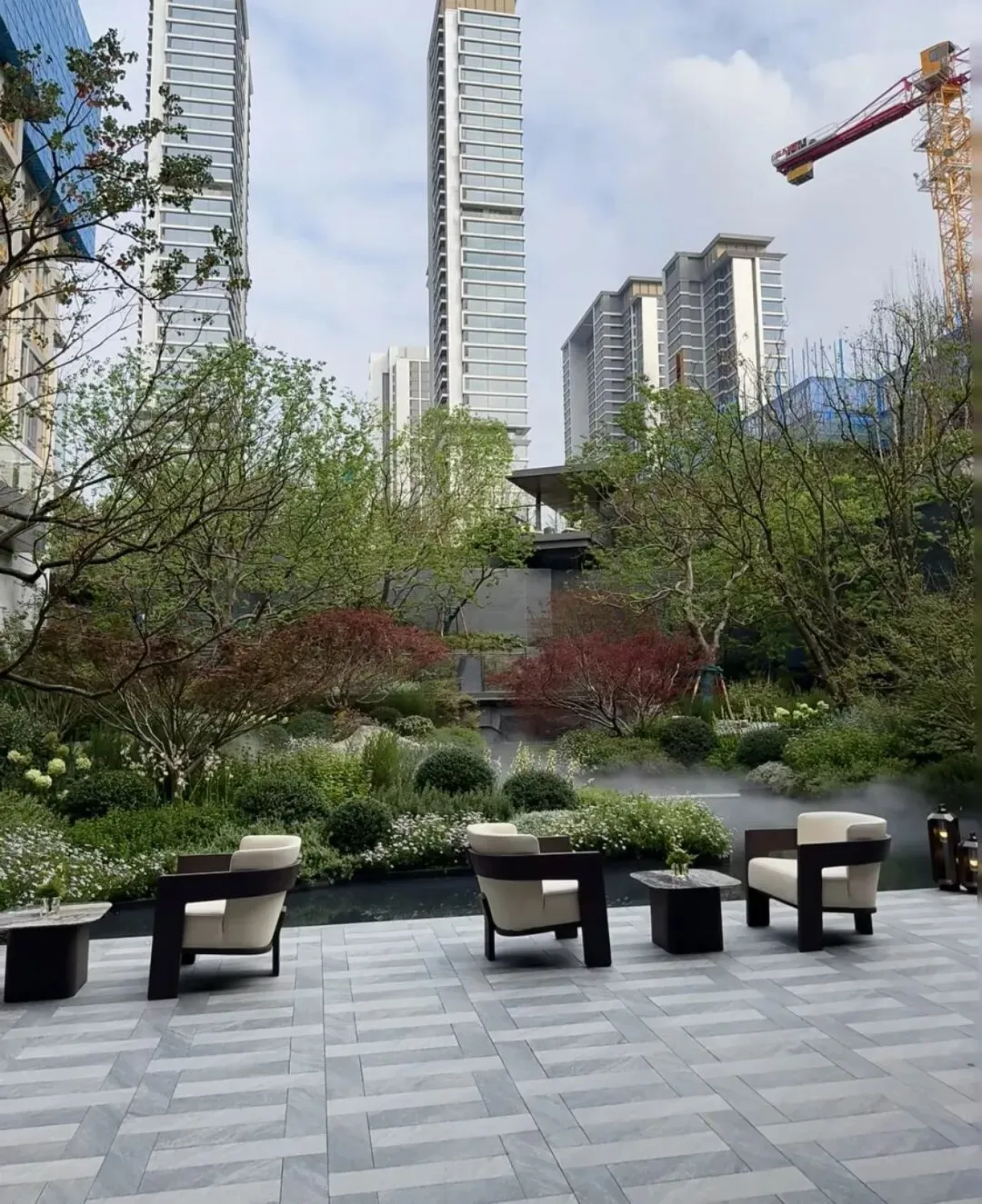 • 家具选择:采用深咖色实木框架搭配米白色户外布艺的单人休闲椅,搭配同色系方形小茶几。这种组合兼顾了舒适度与耐用性,与周围的水景、红枫、雾化装置形成“静与动”的对话。