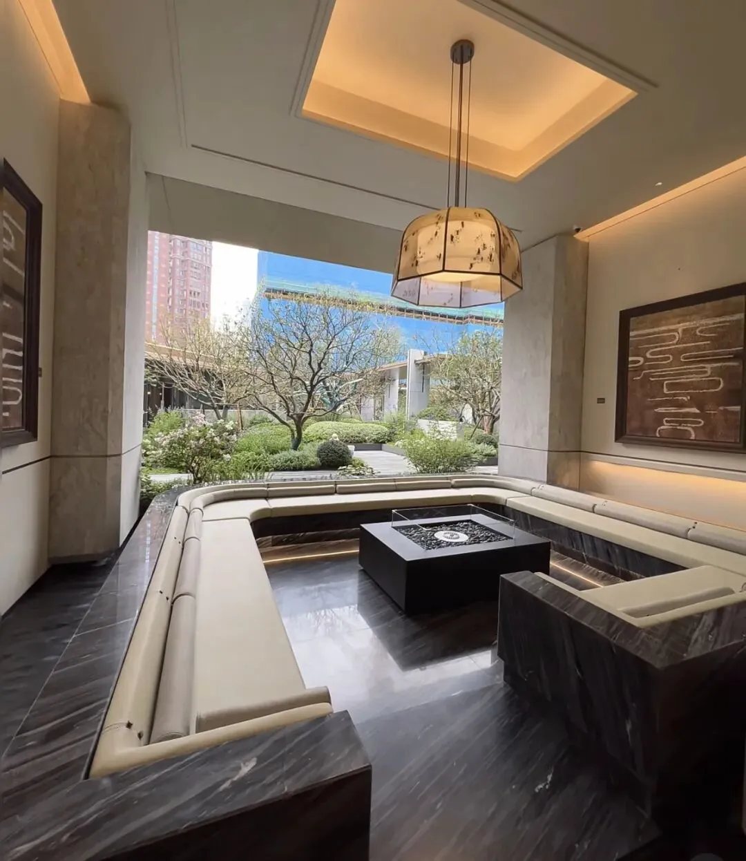 • 材质细节:基座选用保加利亚米黄岩板与深色大理石拼接,与车库、会所等公区材质统一,强化了项目的高端质感;坐垫采用高密度海绵填充,表面为耐磨的科技布面料。
