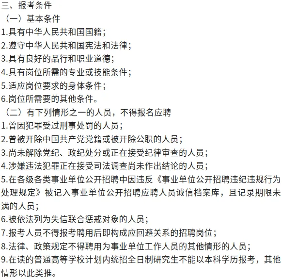 5.资格审查贯穿招聘工作全过程,任何环节中发现报考人员不符合岗位报考条件、提供的报考材料弄虚作假或隐瞒真实情况的,一经查实,取消考试及聘用资格,由此造成的一切损失由报考人员自行承担。