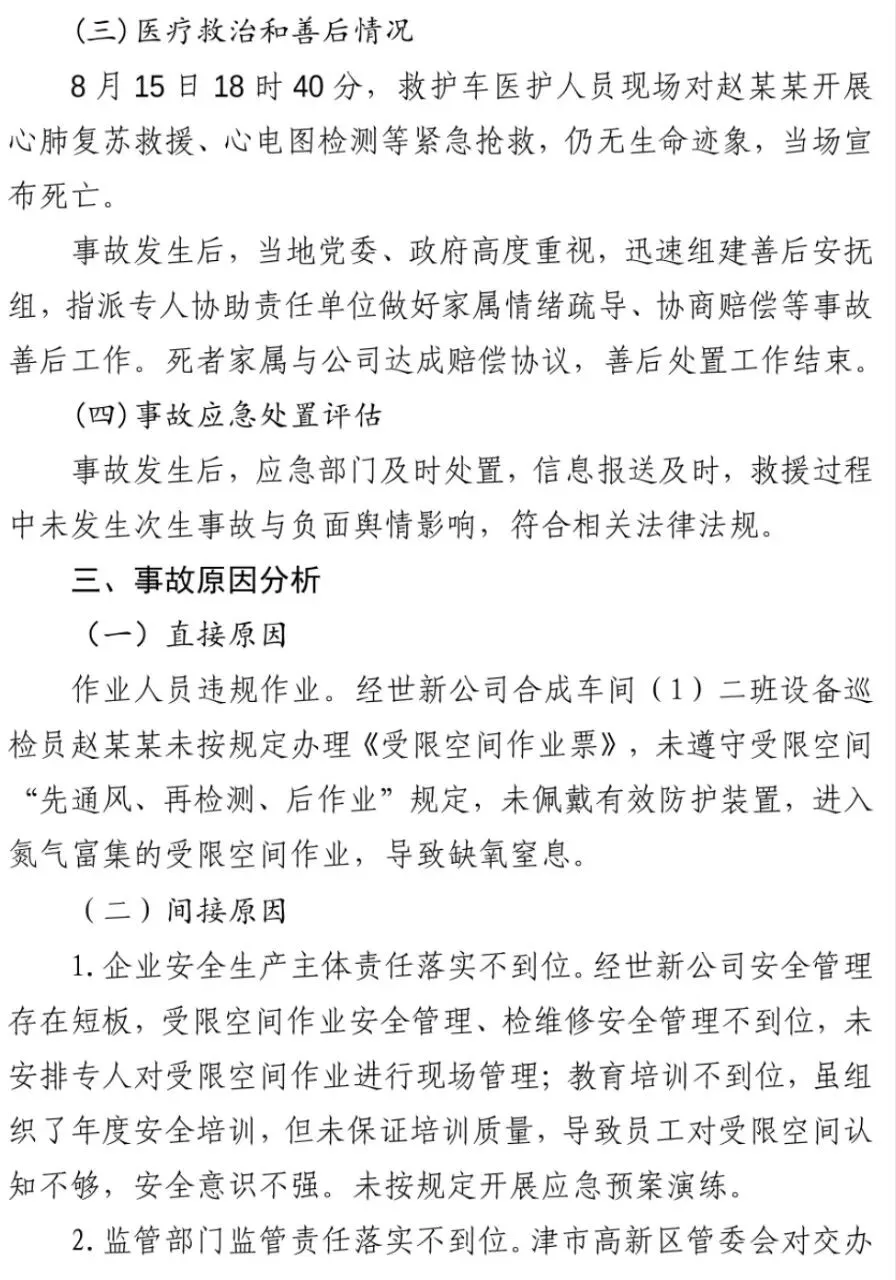 作业人员违规作业。经世新公司合成车间(1)二班设备巡检员赵某某未按规定办理《受限空间作业票》,未遵守受限空间“先通风、再检测、后作业”规定,未佩戴有效防护装置,进入氮气富集的受限空间作业,导致缺氧窒息。