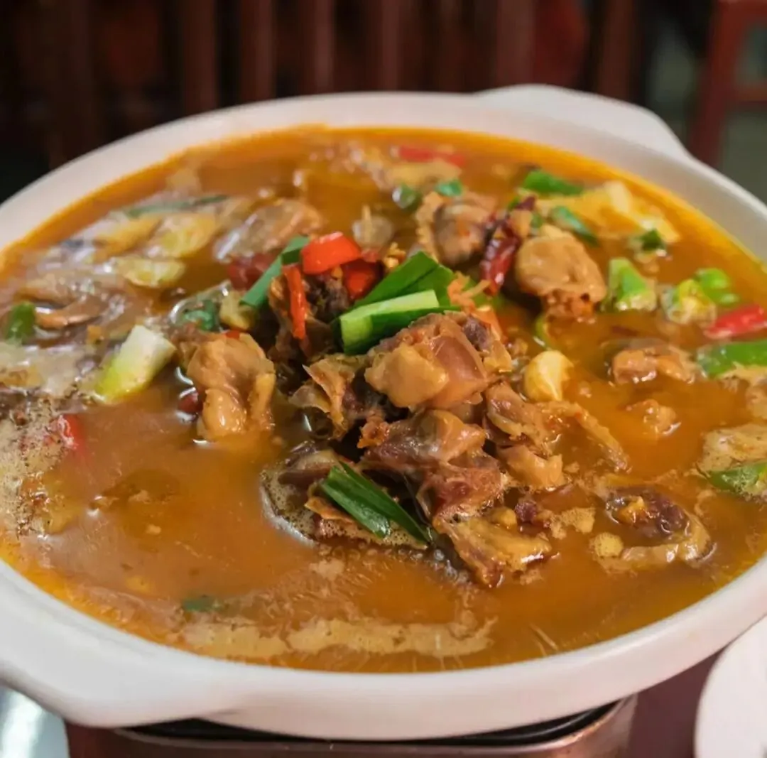 店里口味虾出名,但老板娘推荐我们试试风吹鸡和风吹鸭火锅。食材从常德乡下带来的,墙上还挂着风干的鸡鸭。这个做法跟腊肉不同,不熏,抹盐后自然风干。