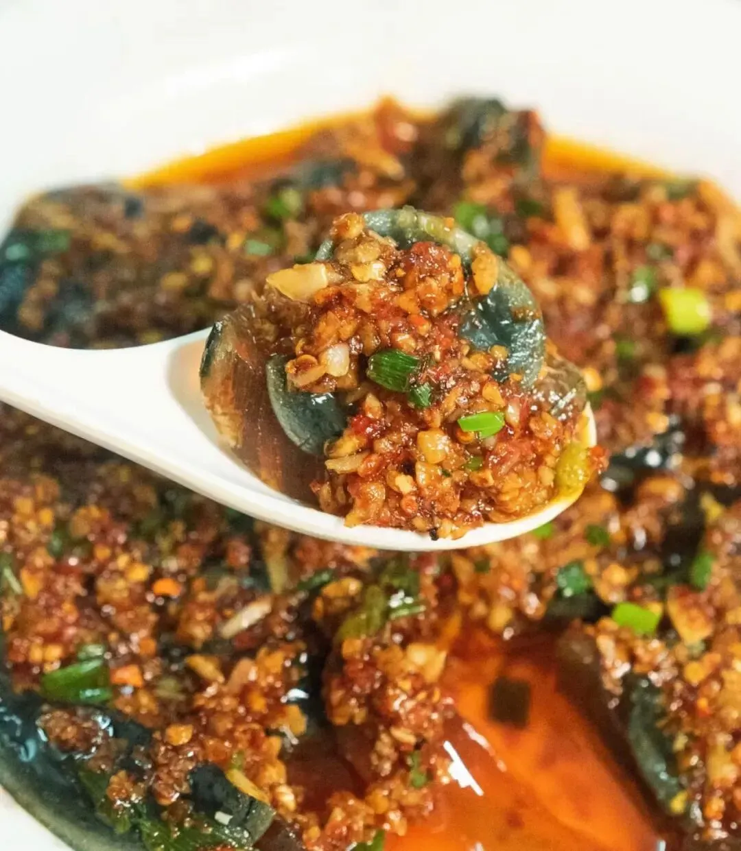 凉拌皮蛋差点没点,翻手机看评论排名前三才加的。端上来黑乎乎一盘,皮蛋滑弹,蒜和辣椒的味道很冲。
