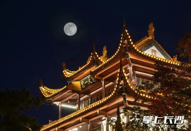 “超级月亮”与天心阁浪漫同框。 长沙晚报全媒体记者 邹麟 摄
