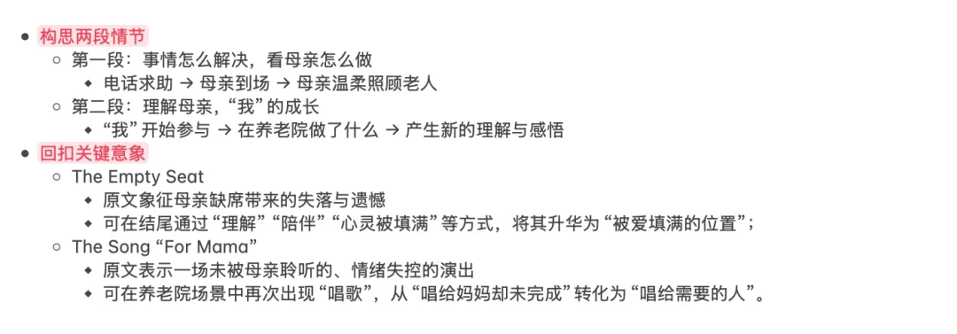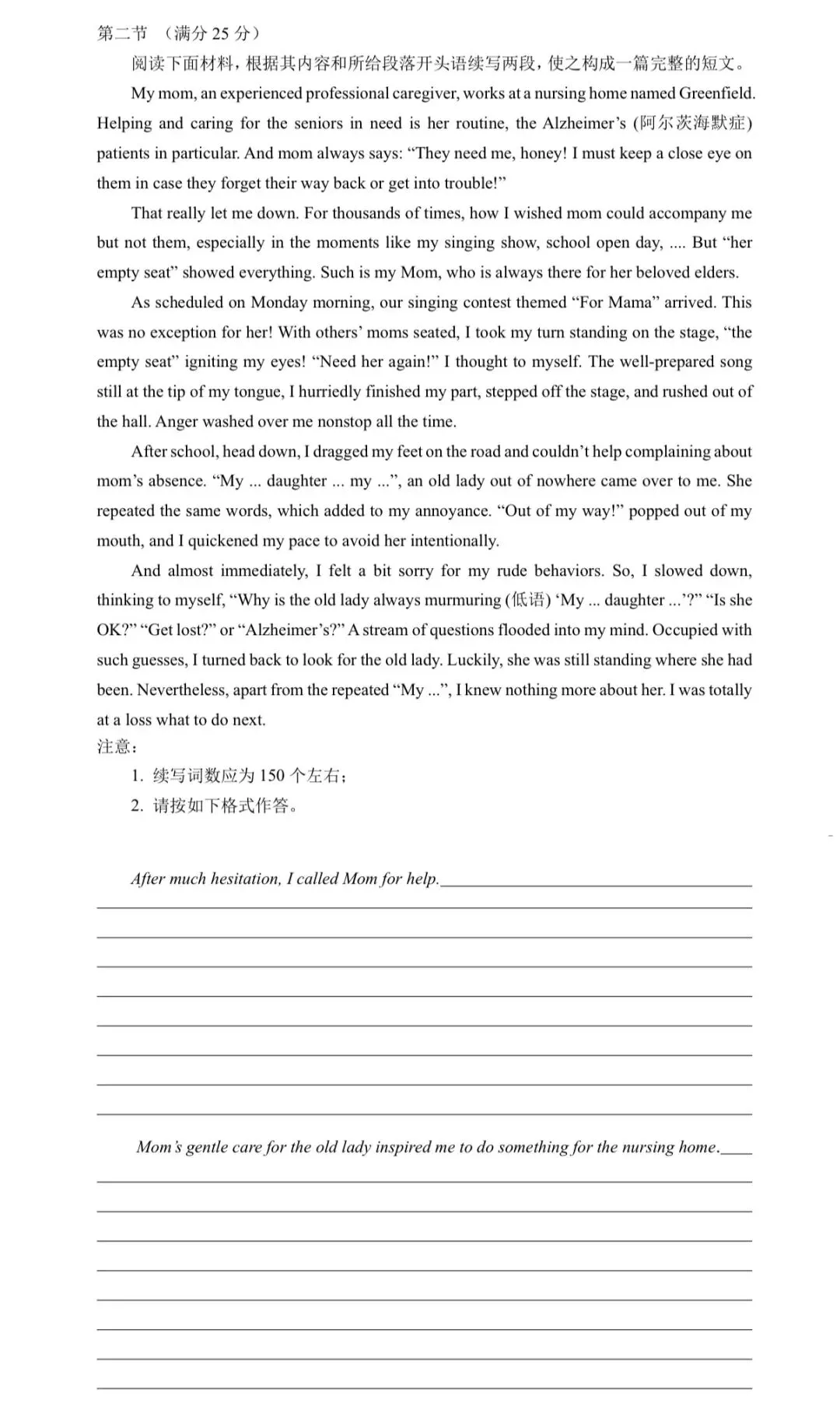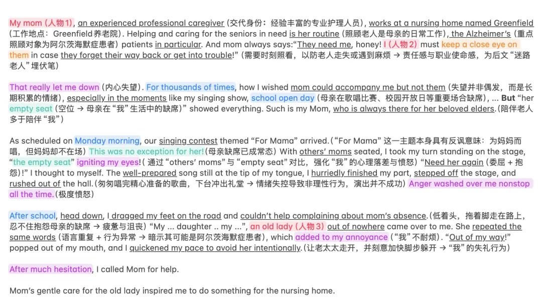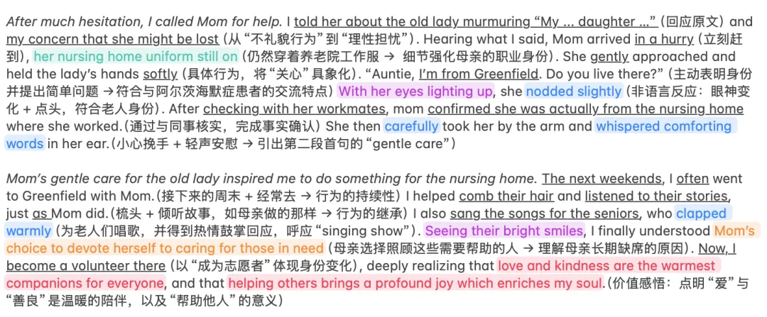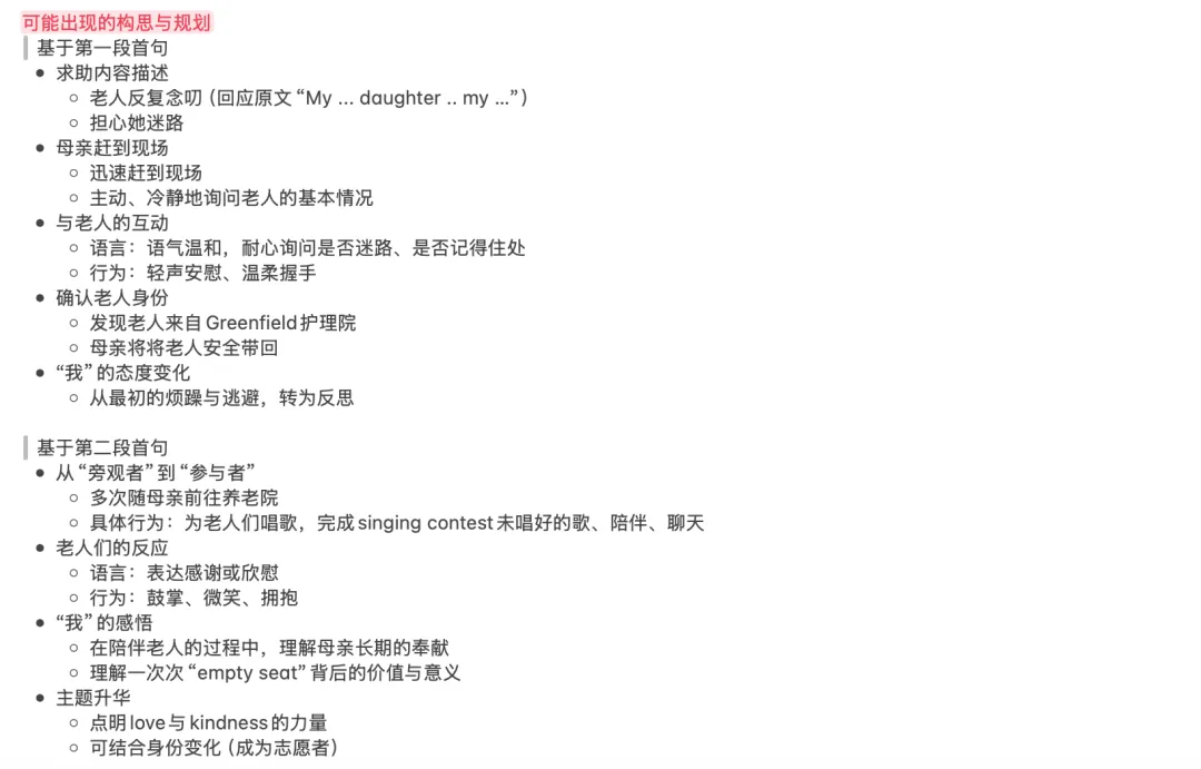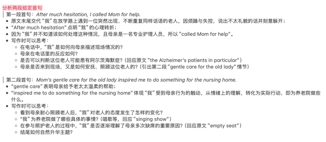 本题给出的两段首句具有明显的功能指向,特别是第二段首句中的“gentle care”,要求大家在第一段末尾交代母亲照顾老人的具体行为,否则将出现情节断裂。