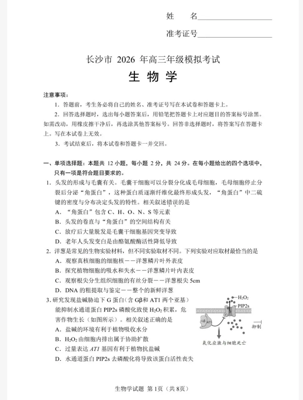 【长沙一模】2026年湖南长沙一模生物试卷+评分标准+解析