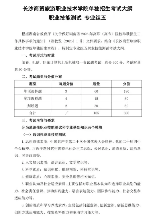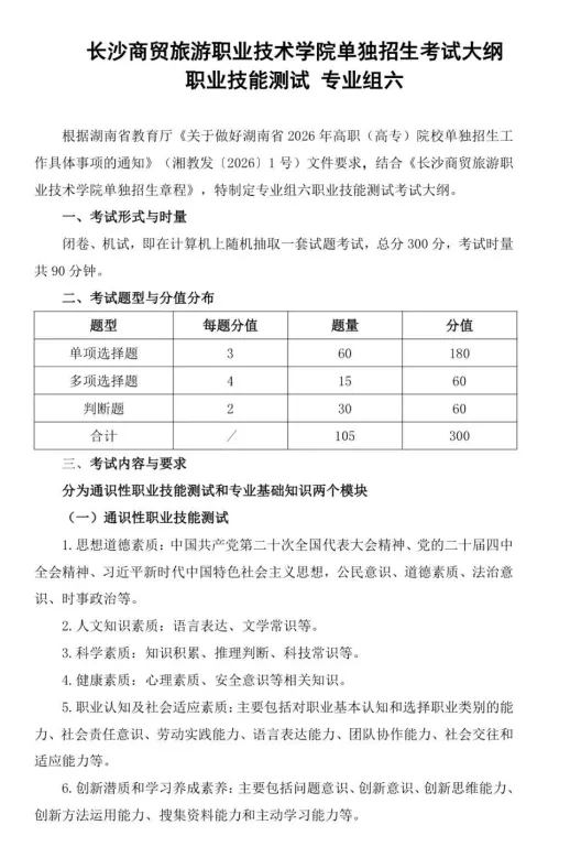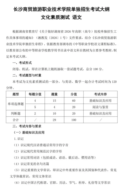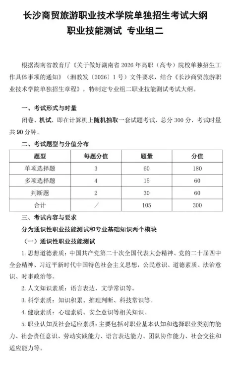 >长沙商贸旅游职业技术学院2026年单招考试大纲及押题试卷