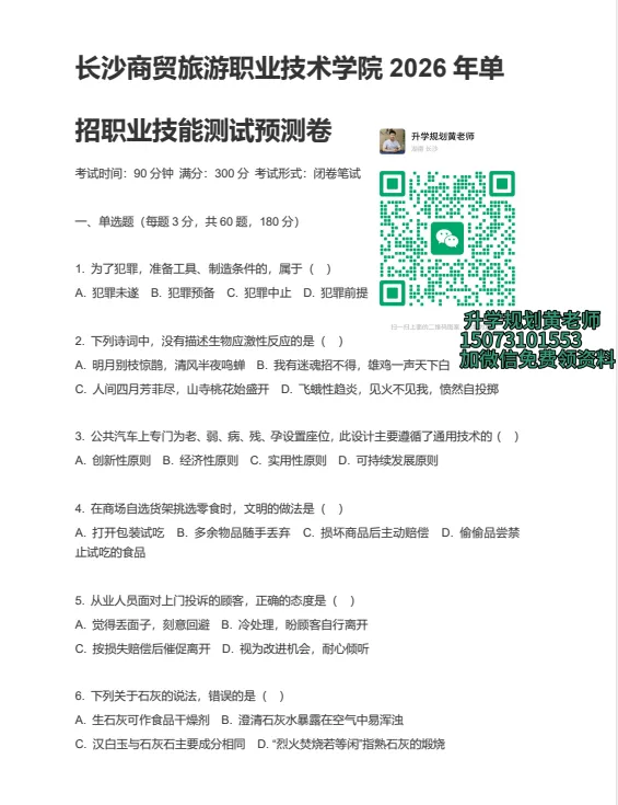 长沙商贸旅游职业技术学院2026年单招考试大纲及押题试卷