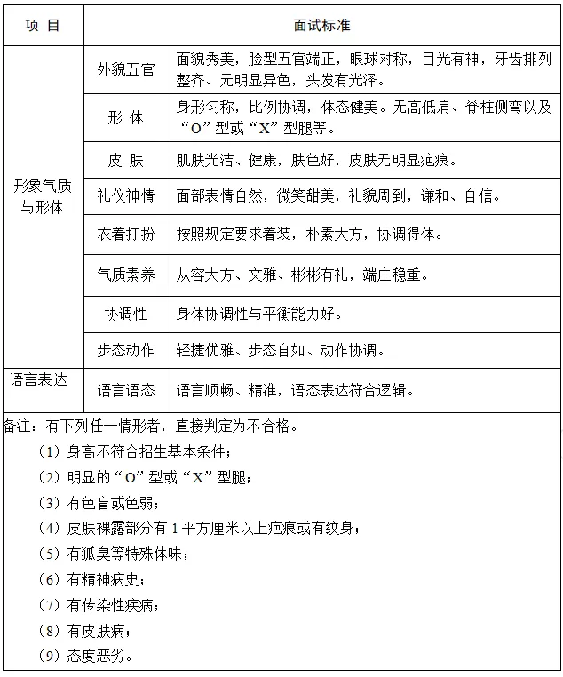 2.专业面试内容:专业面试分为形象气质与形体和语言表达两部分。形象气质与形体主要考查考生外貌五官、形体仪态、气质、皮肤等是否符合专业基本要求,语言表达主要考查考生的表述清晰度、逻辑性、流畅度及沟通时的自信与得体。