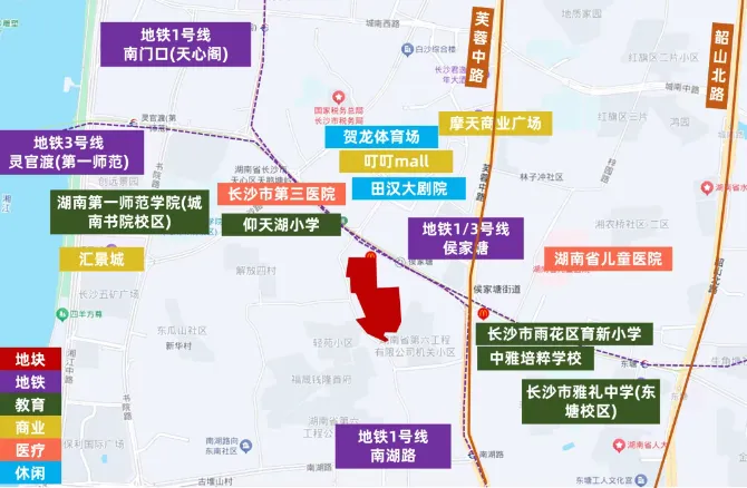 中海锌厂项目地处天心区老城芯——侯家塘,紧邻地铁1号线与3号线换乘站。周边名校云集:仰天湖小学本部、中雅培粹本部、雅礼中学等,教育资源丰富。