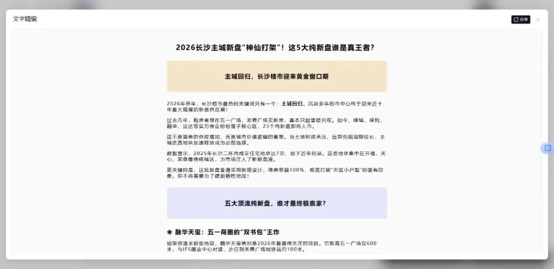 克而瑞·深度智联是地产人的“第二大脑”,房地产行业的首个AI AGENT。它不仅会思考分析,还会提供工作成果,擅长处理您工作中各种场景的任务,可以帮您完成多个复杂工作,是您最佳的AI助手。 主城回归,长沙楼市迎来黄金窗口期