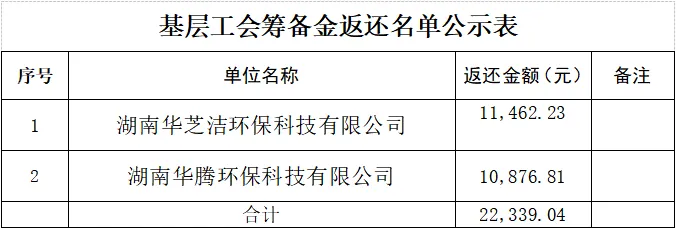根据《中华全国总工会办公厅关于规范建会筹备金收缴管理的通知》(厅字 〔2021〕20号)文件,以及长沙市总工会建会筹备金返还制度要求,工会筹备金按成立工会的时间往前推12个月退上缴筹备金60%部分,由基层工会提交申请资料,经区总工会审核无误后进行返还。返还名单如下: