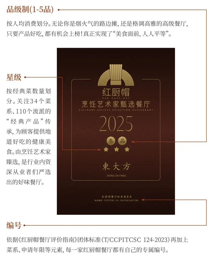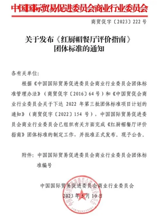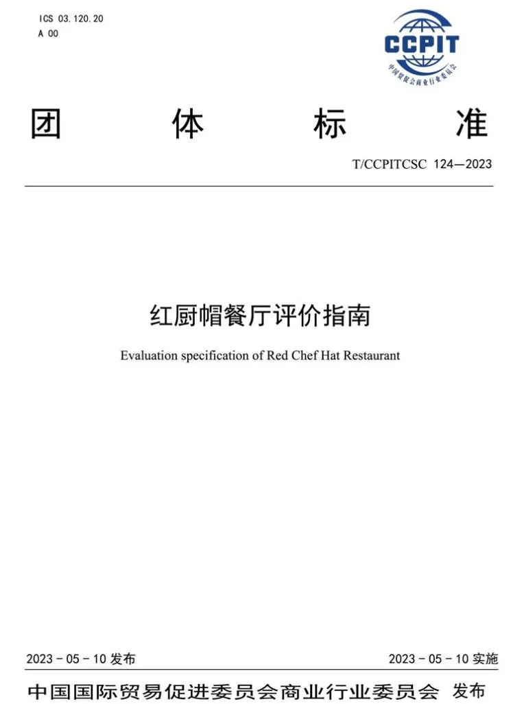 2023年5月,由北京东方美食研究院提出,中国国际贸易促进委员会商业行业委员会归口的《红厨帽餐厅评价指南》(T/CCPITCSC 124-2023)团体标准正式发布,“红厨帽餐厅评价体系”目前是中国唯一具有标准支撑的餐厅评价体系。