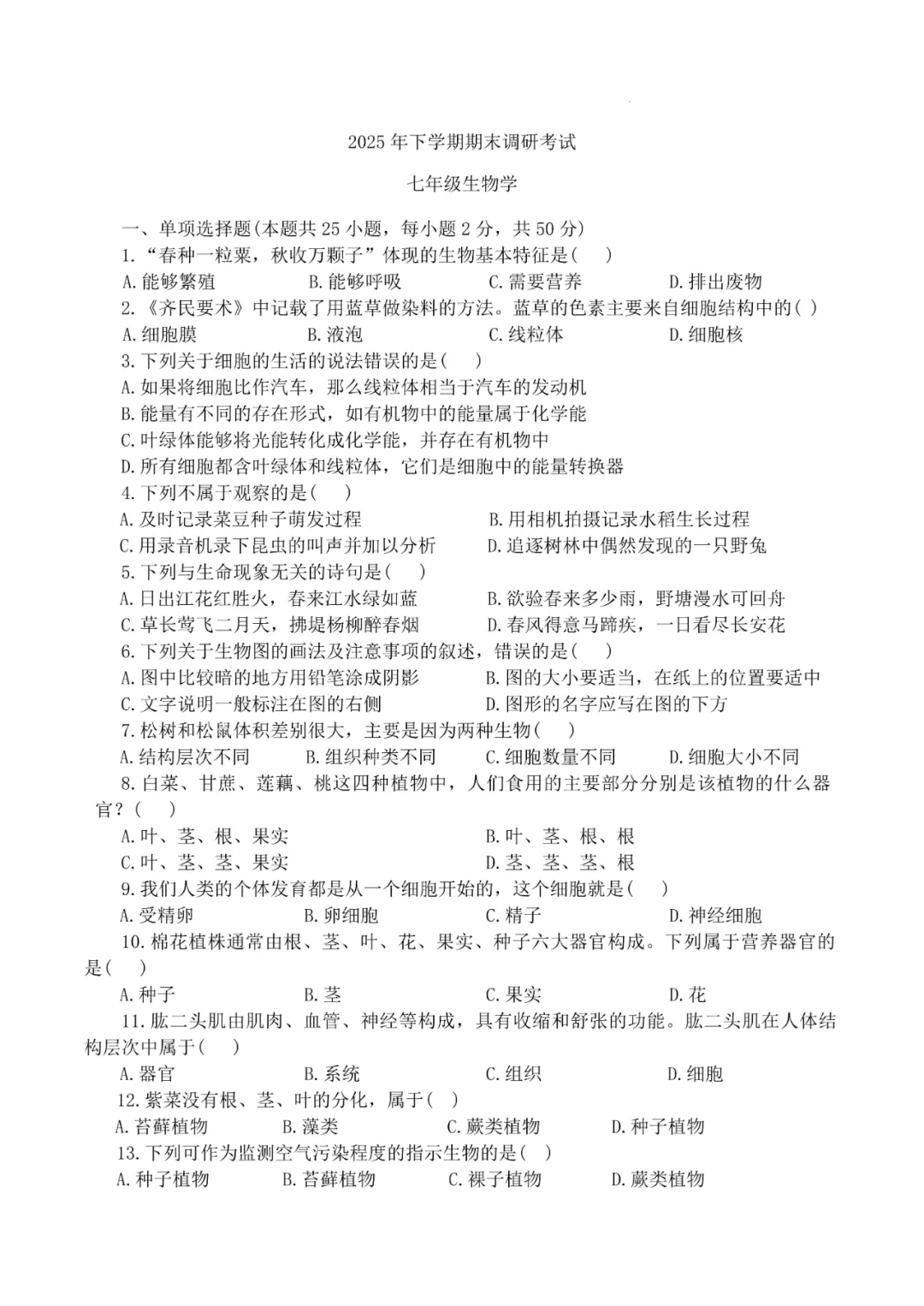 本试卷全面覆盖七年级生物核心内容,重点考查细胞结构、生物分类、动植物特征、微生物应用等关键知识点。得分点集中在基础概念题和现象判断题;难点在于第33题的呼吸器官综合探究和第31题的酵母菌发酵实验分析,这类题目需要学生具备较强的实验设计能力和综合运用知识解决问题的能力,对学生的生物思维深度提出较高要求。