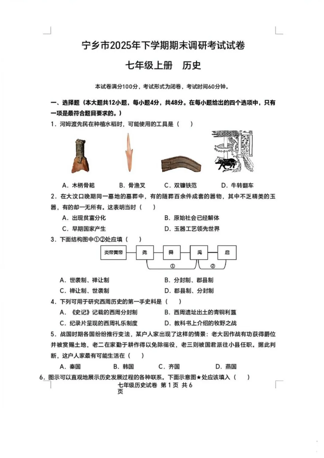 本试卷全面覆盖七年级历史上册核心内容,重点考查中华文明起源、秦汉统一、三国两晋南北朝等关键历史时期。得分点集中在基础史实题和材料分析题;难点在于第15题的历史地图综合分析和第16题的人口迁移影响探究,这类题目需要学生具备较强的时空观念和综合运用知识解决问题的能力,对学生的历史思维深度提出较高要求。