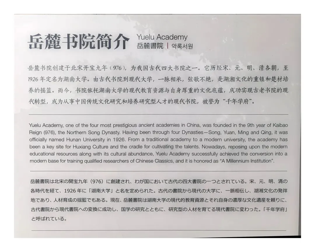 做为中国四大书院之一的“岳麓书院”(江西九江的白鹿洞书院、河南商丘的应天书院、河南登封的嵩阳书院),迄今为止是中国唯一持续办学到现在的古代书院,其教育功能延绵千年。