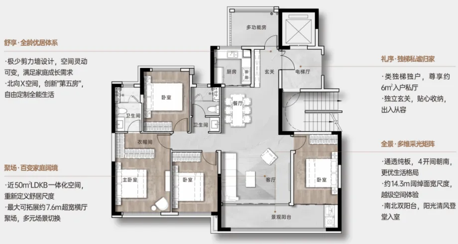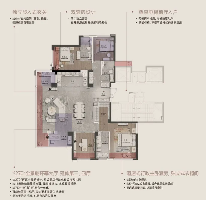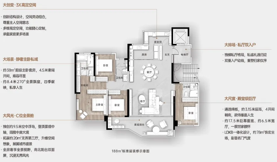 180平大四房,得房率99.3%,270°全景舱客厅。4+1户型,可改空间大。总价约250-260万。