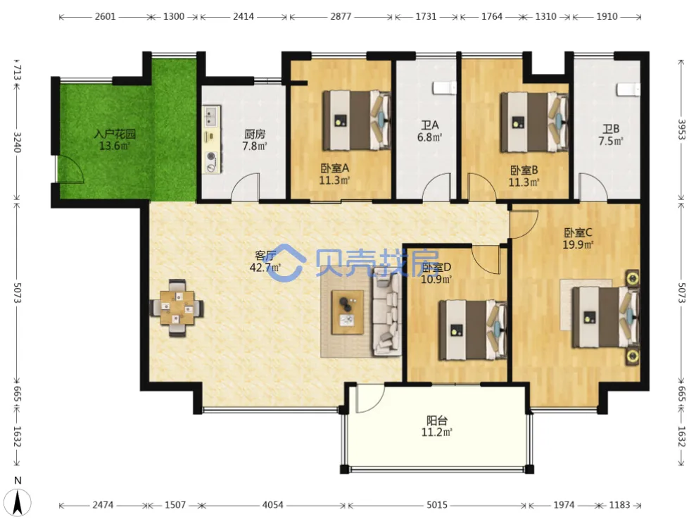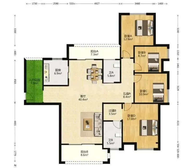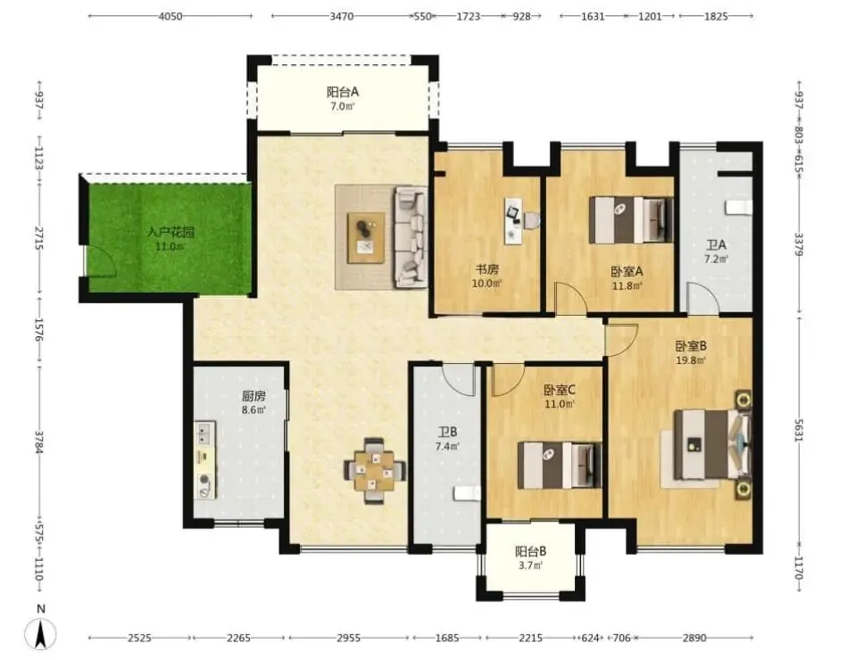 150平,得房率96.3%,四房两厅两卫,带独立电梯厅。总价210万。