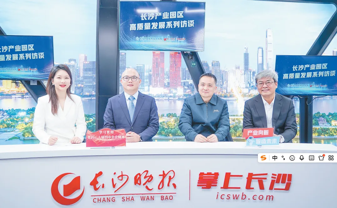 △ 长沙经开区党工委副书记赵文骄(左二)、长城信息股份有限公司董事长李欣(右一)、湖南盛势通科技有限公司总经理唐军(右二)参加访谈。长沙晚报全媒体记者 周数邑 摄